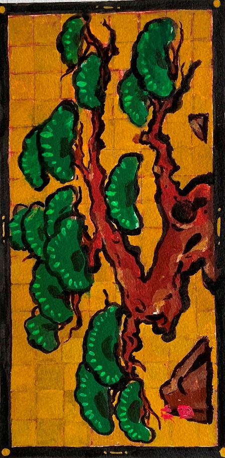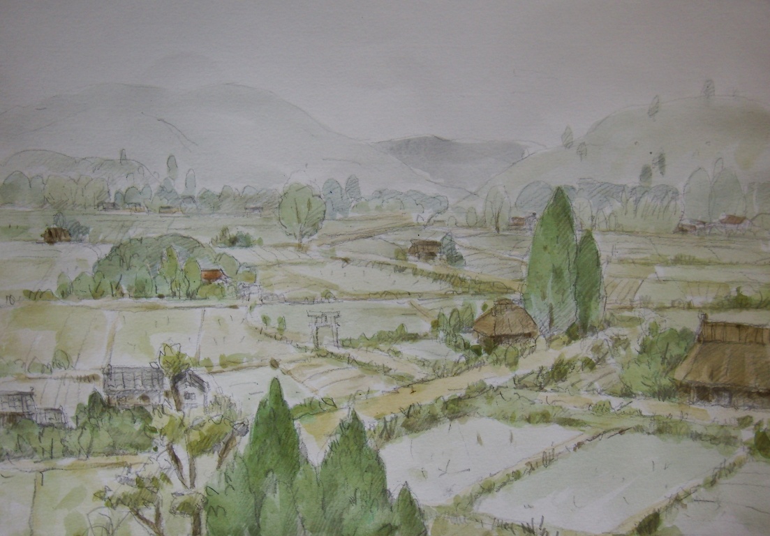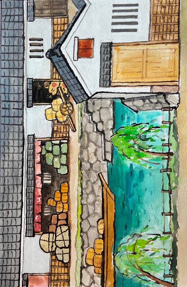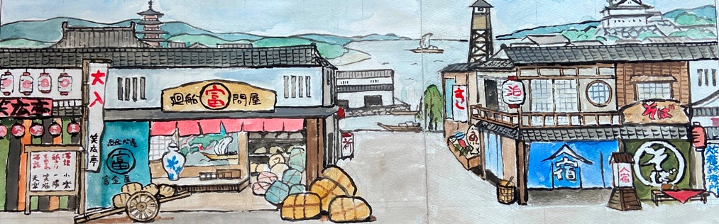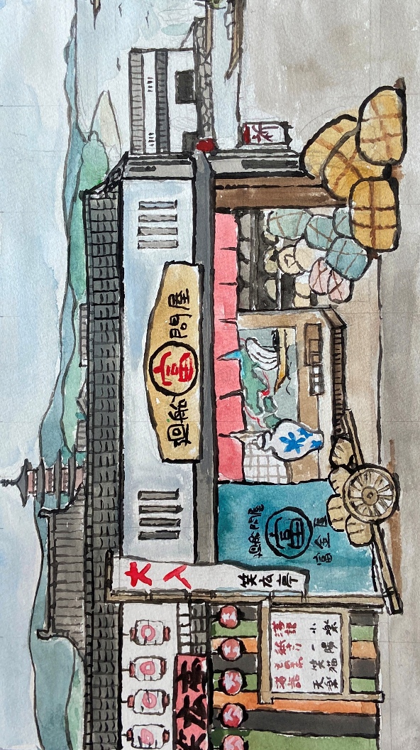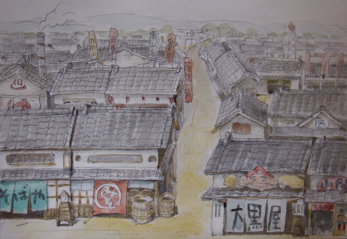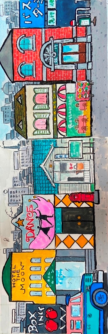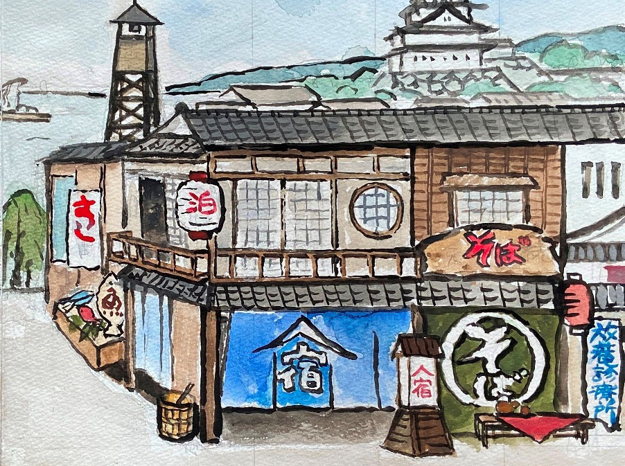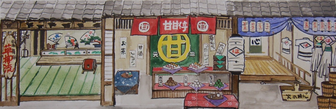 その後、数日かけて登場する商店や役柄にまつわることを調べていると、イメージが次第に輪郭をともなって明瞭になってくる。霧が晴れてぴたっと焦点が合い、頭の中にくっきりと舞台の背景が見えたら、一気にえんぴつで下書きする。空想の羽根を自由に広げ、ここまでは楽しくスムーズにできるのだが、問題はこの後だ。年のせいか、目のせいか、下書きに細かく色をつけていく作業がつらい。
